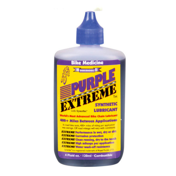 Purple Extreme is an advanced, high performance, synthetic bike chain lubricant. It provides excellent protection for chains, open gears and exposed metal surfaces subjected to severe loading. In addition, it works extremely well even in abrasive, cold, wet or acidic environments. Purple Extreme’s additive technology forms a slippery, super-tough, synthetic film on metal surfaces that protects drivetrain parts far beyond the ability of conventional oils or waxes.